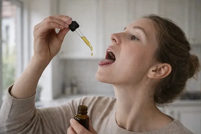 Begin met twee keer twee druppels per dag onder de tong. Houd de olie 30 tot 60 seconden vast voordat je slikt. Verhoog de dosering vervolgens geleidelijk totdat je het gewenste resultaat bereikt. Er bestaat geen standaarddosering, omdat iedereen anders reageert.