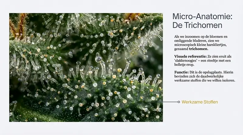 In deze trichomen zitten cannabinoïden en aromatische plantstoffen die samen het profiel van de olie bepalen. Daarom richten producenten zich niet op de hele plant, maar specifiek op deze harskliertjes. Door die focus blijft het extract zuiver en doelgericht.